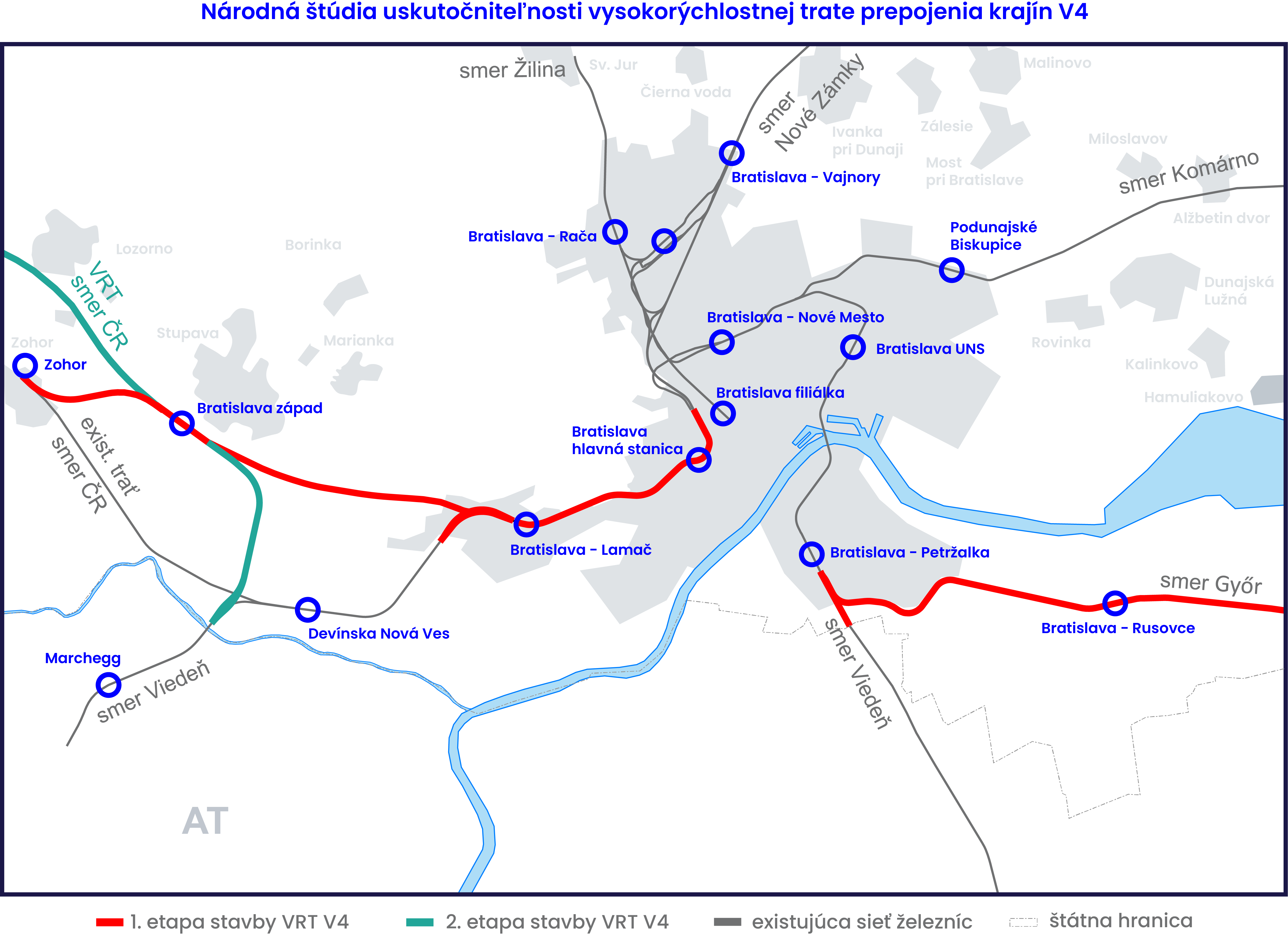 320 km/h, s napojením na českú sieť VRT, - nová spojovacia trať odbočujúca z trate od Marcheggu (Viedne a južnej Európy) za riekou Morava smerujúca do stanice Bratislava západ pre vlaky VRT v smere na Brno (Prahu, Berlín ....).