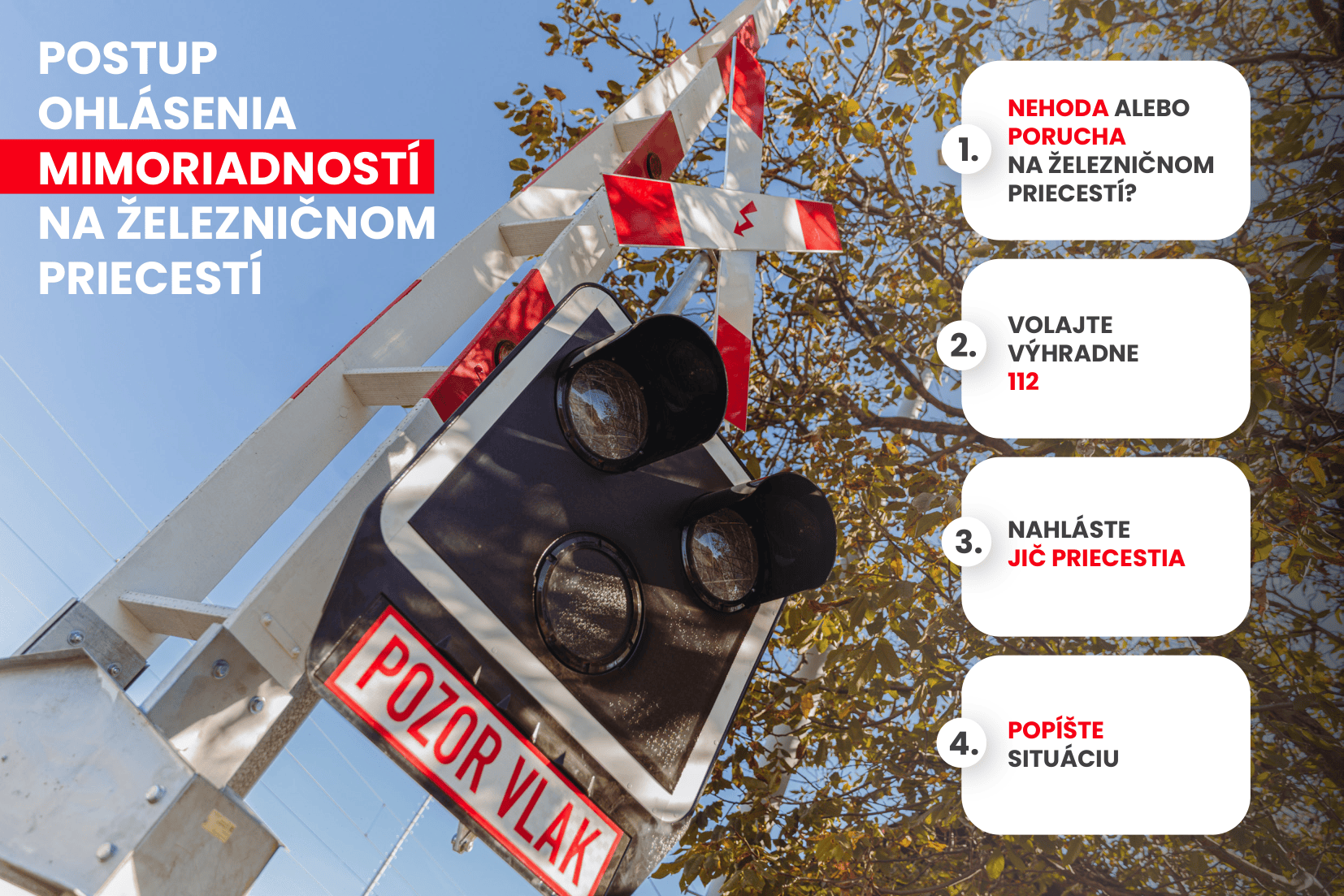 Ak ste svedkom nehody, uviaznutia vozidla, poruchy zariadení infraštruktúry (napr. previs trakčného vedenia) alebo poruchy priecestného zariadenia (napr. nefunkčná signalizácia, porucha závor, poškodený výstražník), je potrebné: